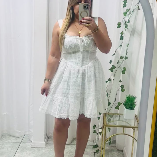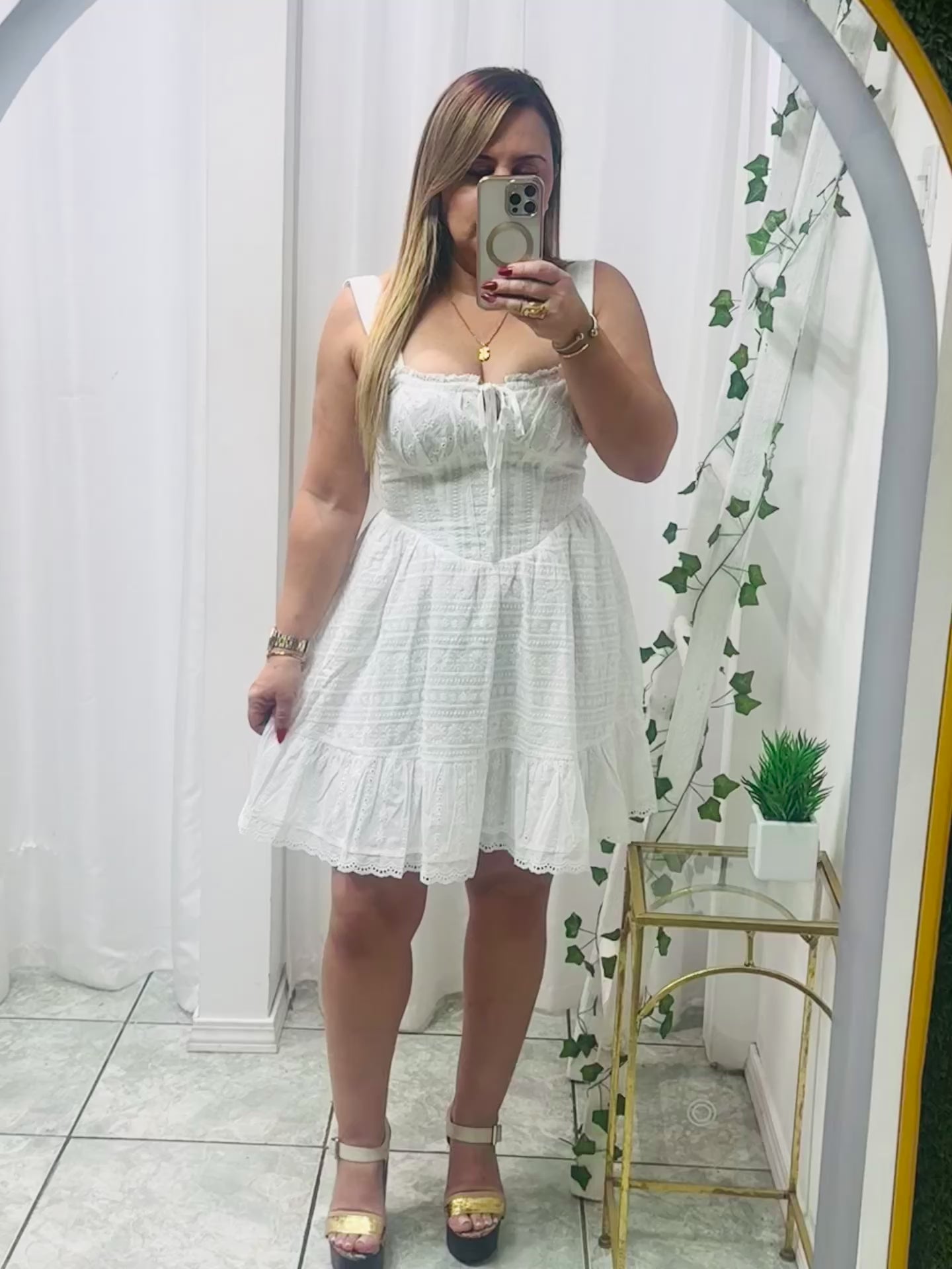Effortless elegance meets comfort in this stunning white eyelet dress. Crafted from soft, breathable cotton with delicate embroidered details, it features a flattering corset-inspired silhouette that defines your waist while keeping you cool and comfortable. Perfect for summer getaways, beach days, or casual vacation wear, this versatile white dress transitions seamlessly from day to night. The intricate eyelet embroidery adds romantic charm, while the relaxed fit ensures you can move freely all day long. A timeless wardrobe essential that feels as good as it looks.